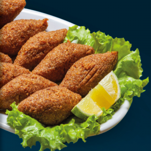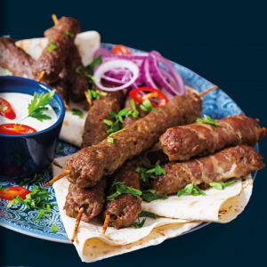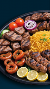 syrischen Gewürzen, serviert mit Reis und Salat