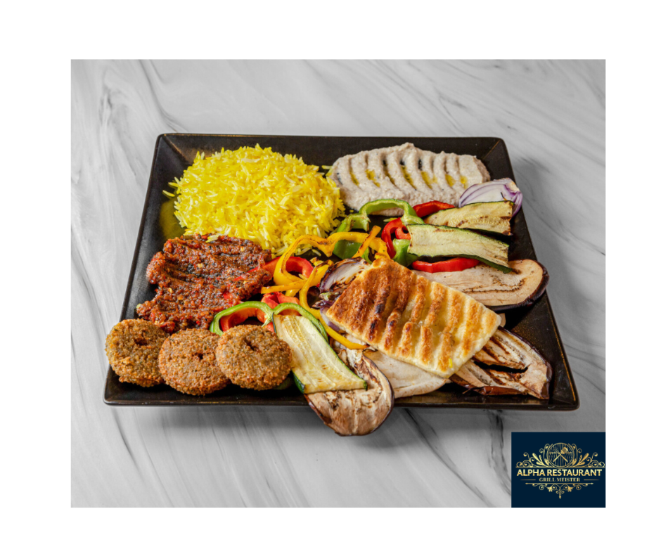 Vielzahl von gegrilltem Gemüse wie Paprika, Zucchini, Auberginen, Pilze undKartoffel, serviert mit Halloumi-Käse und extra Falafel.
